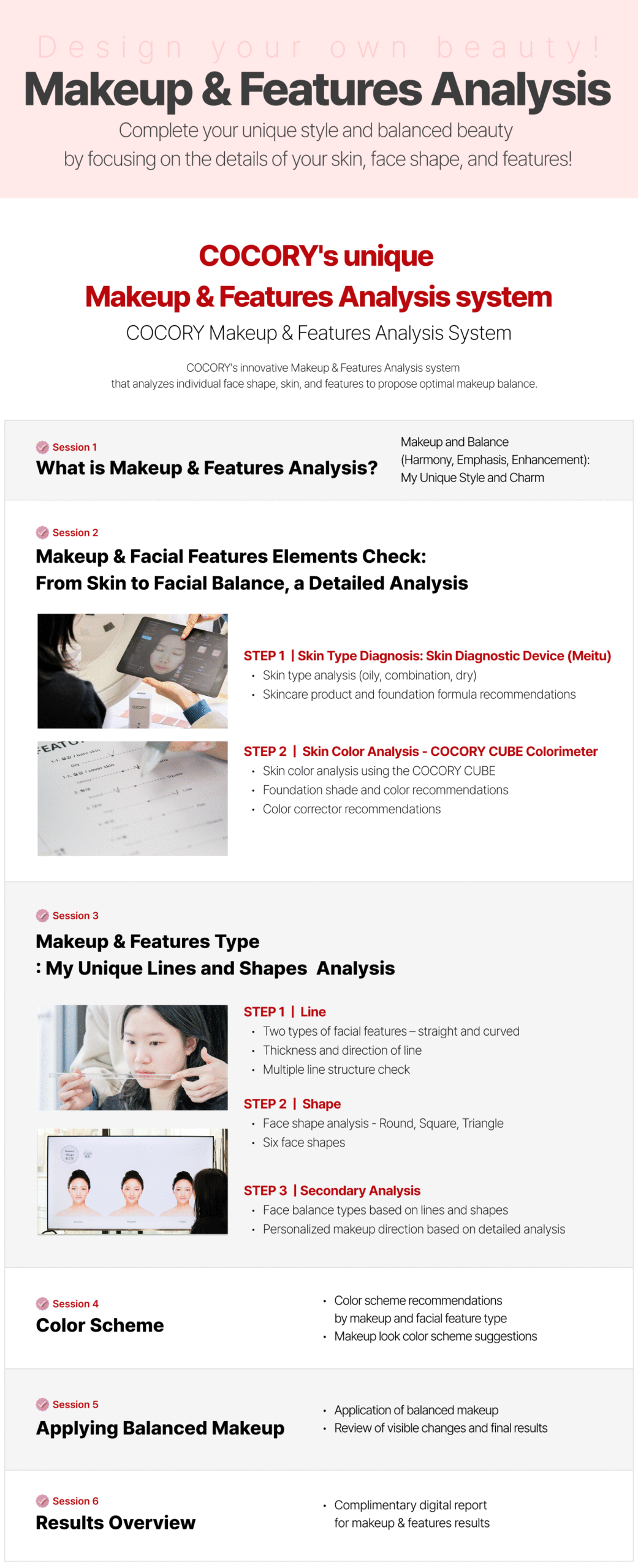 🔹 Personal Makeup : A makeup service using the best color combinations for your skin tone and personal image, based on Cocory Cube analysis.