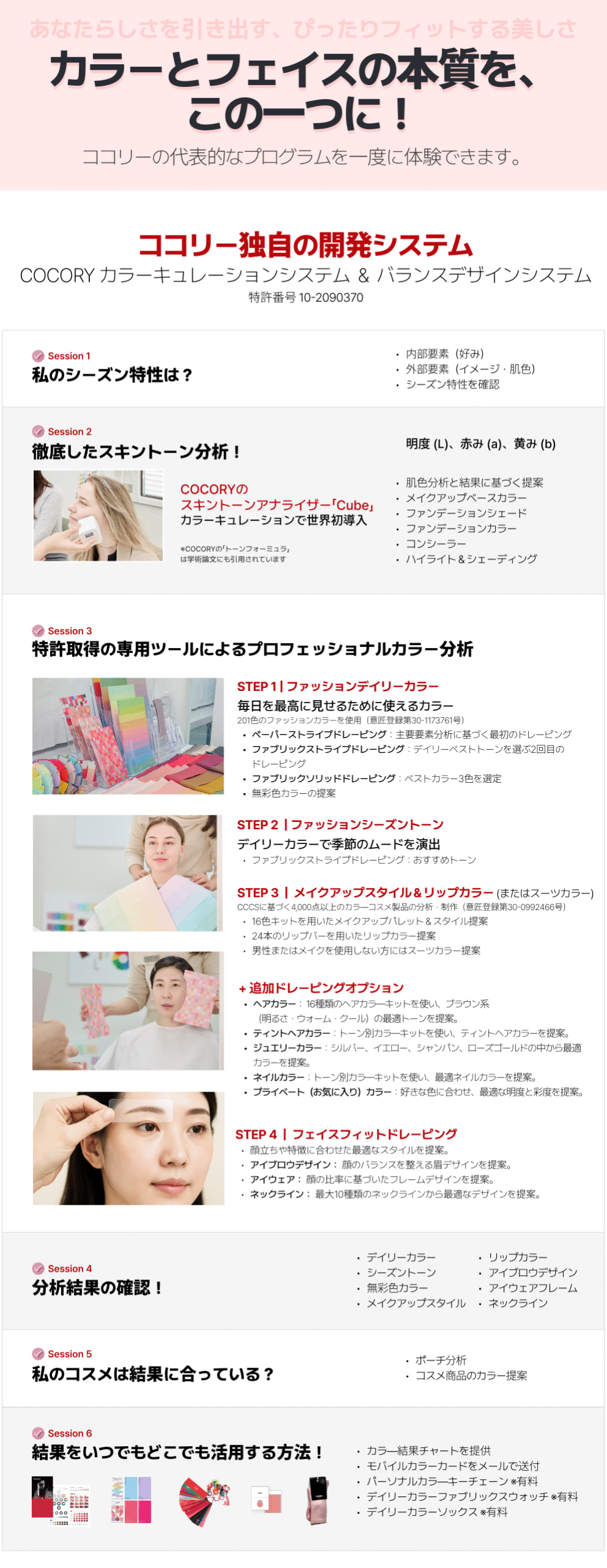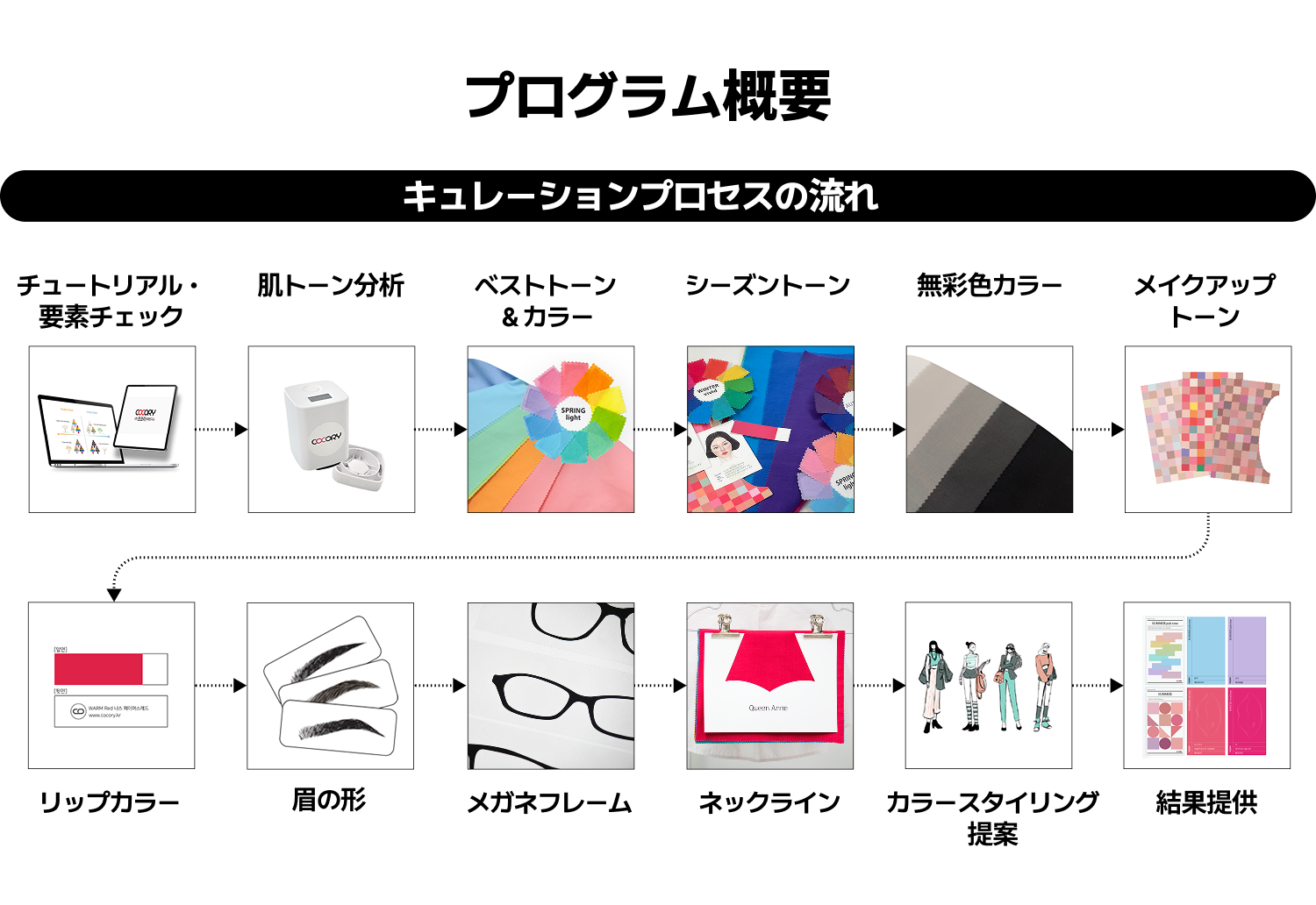 🔹 パーソナルカラー:個人のさまざまな要素をもとに、ファッション・メイク・ヘアにおいて最も調和する色を見つけるプログラムです。
