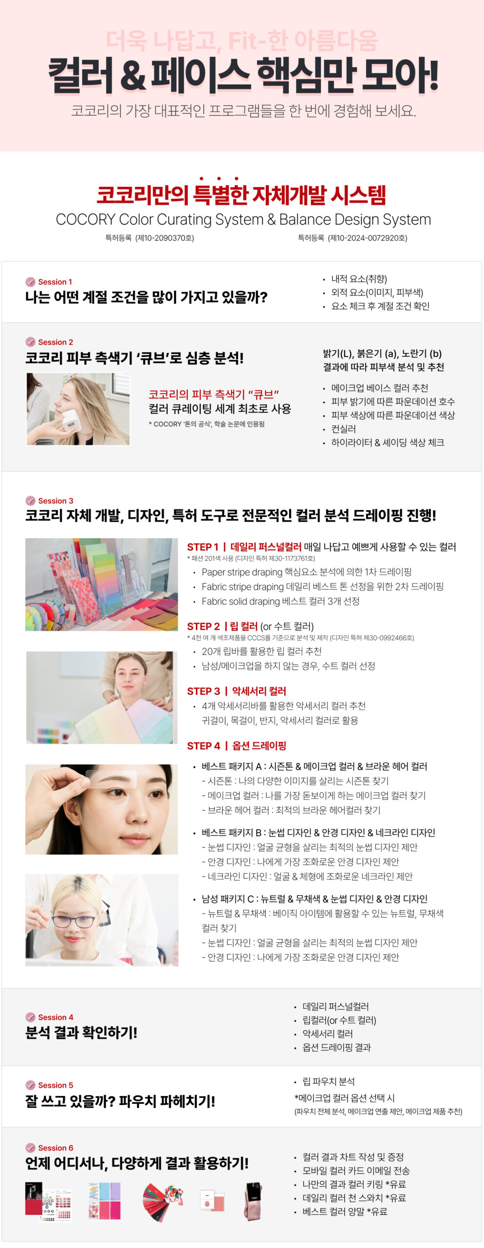 🔹퍼스널 메이크업 : 코코리 큐브로 피부 톤을 진단 후, 개인의 스킨색과 이미지에 어울리는 메이크업 컬러를 찾아 전문적인 메이크업 서비스를 제공합니다.