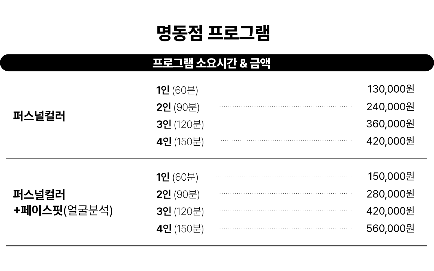 🔹퍼스널컬러 :  고객님의 내적 요소와 외적 요소를 전문적으로 진단하여 패션, 메이크업, 헤어 컬러 등 가장 잘 어울리는 컬러를 찾아드리는 프로그램입니다. 자신에게 어울리는 조화로운 컬러를 알고 싶은 분들께 추천드립니다.
