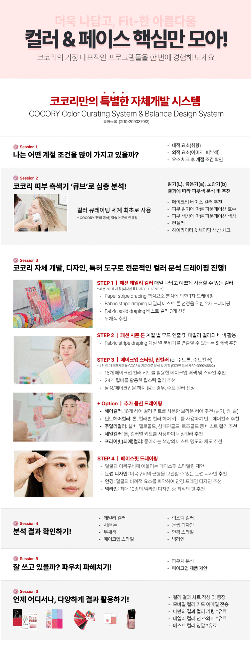 🔹데일리 메이크업 : 코코리 큐브로 피부 톤을 진단 후, 개인의 신체색과 이미지에 어울리는 메이크업 컬러를 찾아 전문적인 메이크업 서비스를 제공합니다.